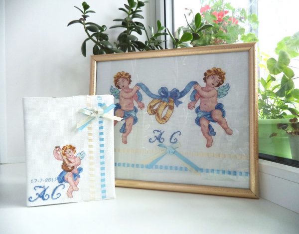 Так само можна за допомогою спеціальних програм зробити з фотографії коханої пари схему для вишивки і власноруч вишити їх портрет. Якщо не вистачає часу і майстерності – зверніться до художника, який намалює майбутніх молодят, а рамку прикрасьте цікавою гравіюванням або гарними побажаннями.