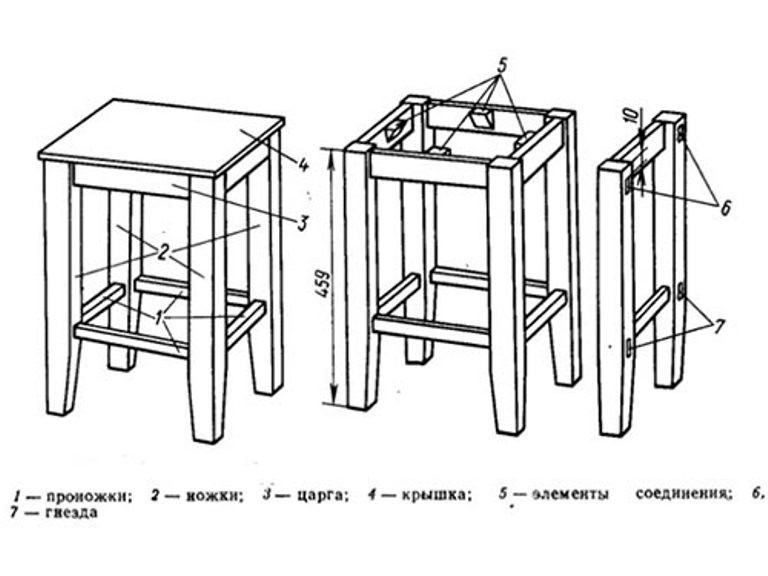 Табурет має чітко встановленої конструкцією. Це сидіння з чотирма стійкими ніжками, які також скріплені між собою. На відміну від інших предметів меблів, які призначені для відпочинку, цей стілець не має спинки і підлокітників.