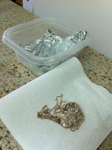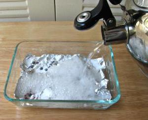 Накриваємо миску фольгою, насипаємо 3 столових ложки соди, кладемо срібні прикраси, накриваємо фольгою і заливаємо окропом. Через 15 хвилин промиваємо холодною водою.