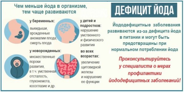 Йод є необхідним мікроелементом, який входить до складу гормонів щитовидної залози. Недолік цього галогену призводить до того, що щитовидна залоза не може виробляти ці гормони, що негативно відбивається на роботі всіх систем, насамперед нервової. Людина стає млявою, легко впадає в депресію.