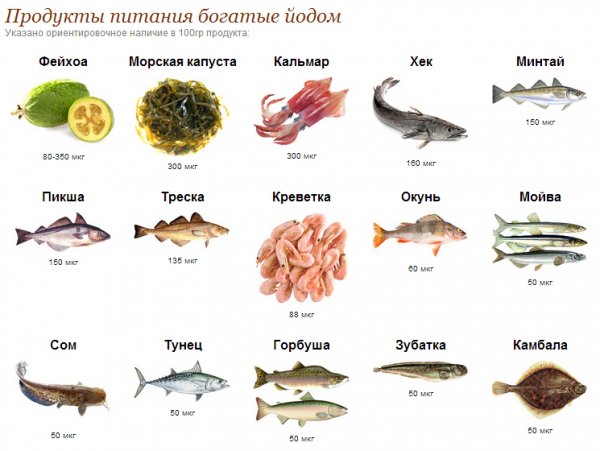 Як видно з таблиці, продукти, що містять йод у великій кількості (що дуже корисно для щитовидної залози) — це в основному риба.