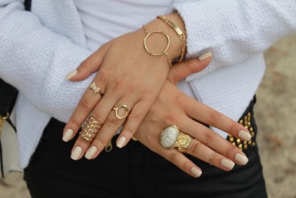 Дівчата також можуть вибирати скромні кільця і браслети, але в цьому випадку бажано надягати відразу по кілька штук прикрас.