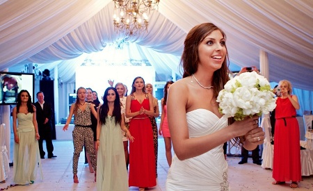 В кінці вечора наречена кидає свій букет незаміжнім подругам і та, яка його зловить, має незабаром вийти заміж. Аналогічний ритуал проводить і наречений зі своїми неодруженими друзями (в цьому випадку впадає підв’язка нареченої). Традиція уособлює собою доброзичливість і щедрість нової сім’ї.