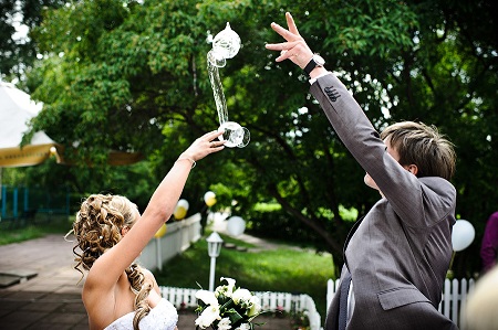 Весільні обряди, пов’язані з биттям посуду, активно застосовувалися в староруських весіллях. Вважається, що розбиті келихи в день одруження — до щасливого сімейного життя молодого подружжя. Для цих цілей сьогодні спеціально декорують окрему пару фужерів. Раніше били частіше не келихи, а тарілки, при чому по осколках судили про те, хто першим народиться у подружжя: великі частини обіцяли поява первістка-хлопчика, дрібні — дівчинки.