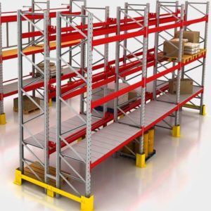 На полицях гравітаційного стелажа, встановлюється роликові доріжки. З їх допомогою, вантаж переміщується під нахилом. Після того, як товар поміщає на конвеєр, він доїжджає до зони вивантаження, де автоматично зупиняється з допомогою гальмівних роликів. Після розвантаження, місце старого піддону займає новий. Проходи між рядами відсутні, тому складську площу можна використати більш ефективно. Товари з обмеженим терміном придатності найзручніше зберігати на гравітаційних стелажних систем. Вони є найбільш зручними, тому що не вимагають втручання робітників, але в той же час і є найдорожчими, за рахунок автоматизації процесу.