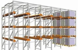 Однотипну продукцію, без обмежень по терміну придатності, зручно зберігати в набивних стелажних систем. Найчастіше вони застосовуються на виробничих підприємствах і складах тривалого зберігання. Конструкція складається з поперечних балок і вертикальних рам, встановлюється блоками. Висоту рам, як і відстань між балками, можна настроювати під певний тип зберігається вироби. Для приміщення товарів, потрібно використовувати додаткову техніку, наприклад, вантажники, які можуть заїхати всередину стелажа. Необхідно враховувати, що товар, який був першим поміщений на полиці, буде відвантажено в останню чергу. Також вони дозволяють економити багато місця, тому що між стелажами відсутні проходи.