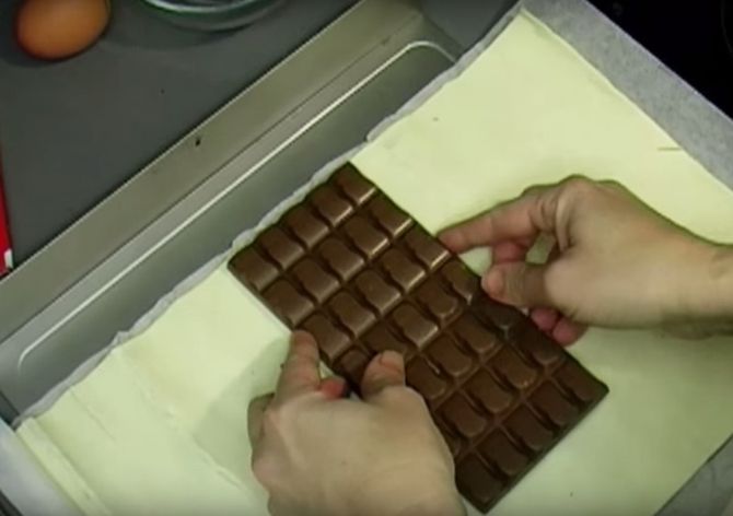Ліжка на робочу поверхню папір для запікання, а на неї — листкове тісто. Поклади плитку шоколаду точно в середину листкового пласту, як показано на картинці.