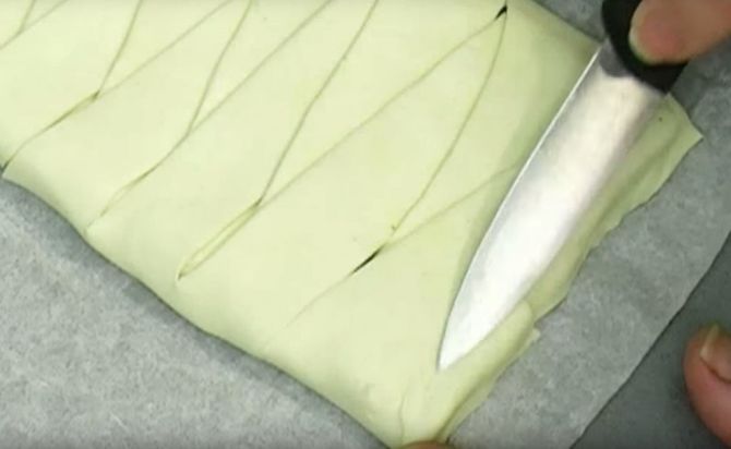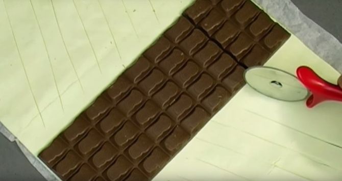 Тепер зроби на тесті надрізи шириною приблизно 2 див. Починай від плитки шоколаду до краю тесту, надрізаю трохи по косій.