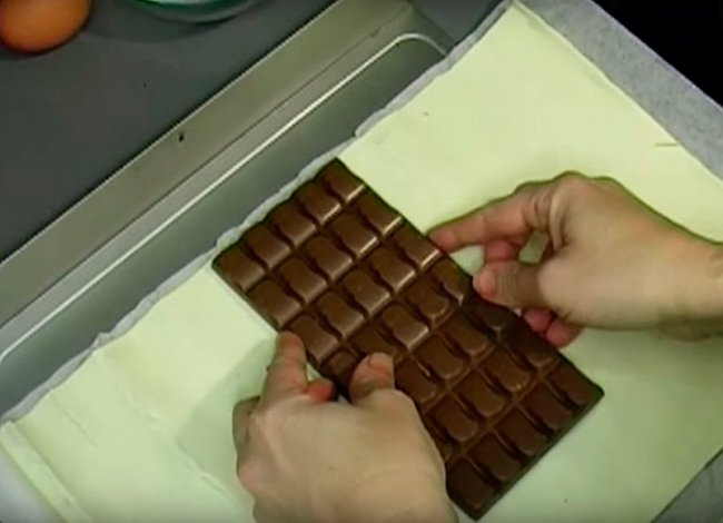 Ліжка на робочу поверхню папір для запікання, а на неї — листкове тісто. Поклади плитку шоколаду точно в середину листкового пласту, як показано на картинці.