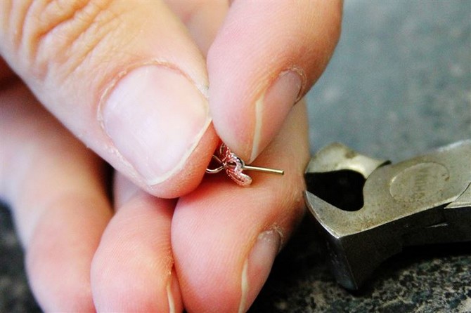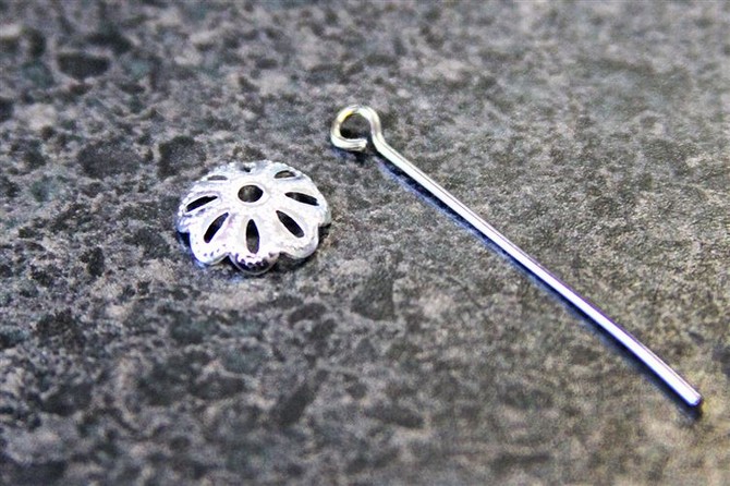 Пін просмикніть в шапочку для намистини і загорніть літерою “Р”, відрізавши зайве, щоб зафіксувати кінець.