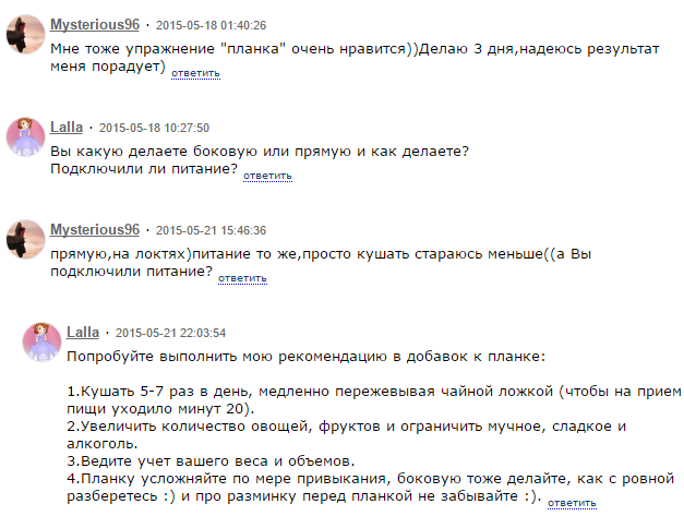 «Даний метод допоміг мені боротися з надлишками ваги, хоча у мене ніколи не було сильного ожиріння, все таки від природи красивої та стрункої фігурки у мене ніколи не було. Коли я прийшла на фітнес, тренер відразу сказала, що необхідно доповнити комплекс вправ домашніми тренуваннями, прийшли до висновку, що почну освоювати «планку». Всього за один місяць моя фігура змінилася, вправа «планка » за відгуками інших моїх результатів показало ідеальні результати, навіть сьогодні я продовжую його використовувати, щоб зробити фігуру більш ідеальною.»