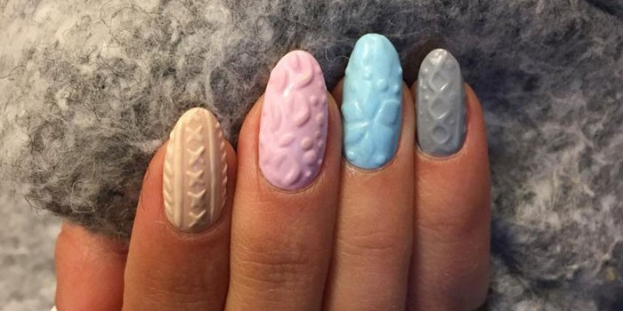 Такий дизайн тримається на піку популярності вже не один сезон. Він виглядає дуже ніжно і тепло, адже в’язання на нігтях у вигляді об’ємних орнаментів пастельних кольорів, покритих оксамитовим піском, не може не зігріти в зимову холоднечу. Ідеї для створення манікюру ви можете розглянути на представлених фото або ж повторити лінії на вашому в’язаному светрі, плаття або кардіганом.