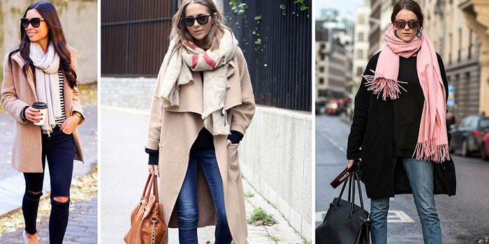 Ідеї, як носити хустку з пальто, припускають розміри жіночого аксесуара близько 1 квадратного метра: