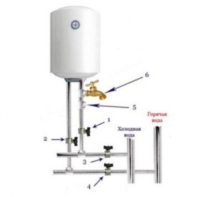Малюнок показує, де розташовуються стояки з холодною водою, вони відповідним чином підписані. Цифрами 1 і 2 позначені запірні вентилі на холодну і гарячу воду, 3 і 4 — також вентилі, що регулюють подачу води по квартирі. Кран 3 перекривають при необхідності перекрити воду в квартирі, а четвертий при роботі котла перекривається, щоб уникнути догляду гарячої води в стояк будинку. Під номером 5 вказано місце, куди монтується зворотний клапан. Номер 6 — кран для зливу води з котла. Він використовується при необхідності чищення, ремонту або демонтажу приладу.