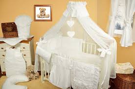 - Розташування у головах. Полотно спадає на фронтальну частину ліжечка малюка. Цей варіант вибирають для дівчаток і старших діток.