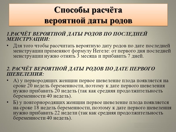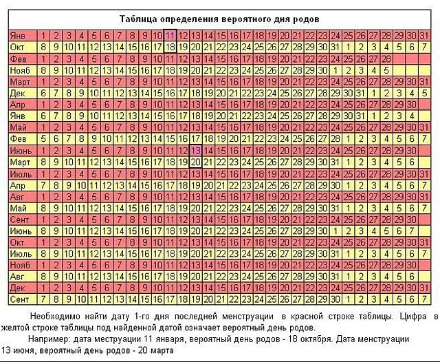 Приміром, у майбутньої матусі цикл дорівнює 28 днів, тоді вихід клітини для запліднення припадає на дванадцятий-чотирнадцятий день. До дня допустимого зачаття слід додати двісті вісімдесят днів. Після цього може бути отримана дата пологів.