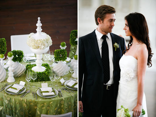 Традиційне біле плаття нареченої можна доповнити яскравими аксесуарами зелених відтінків (туфлі, прикраси). А подружок нареченої можна нарядити в зелене вбрання, колір яких знаходить своє відображення у зелених аксесуарах образу майбутньої дружини. Наречена, яка хоче вибрати оригінальний весільний наряд, може надіти плаття зеленого, фісташкового або салатового. Для нареченого кращі звичні відтінки – чорний, сірий, темно-синій або бежевий (для костюма). При цьому важливо, щоб образ нареченого був у гармонії з образом нареченої: для цього можна використовувати зелений колір сорочки або бутоньєрки.