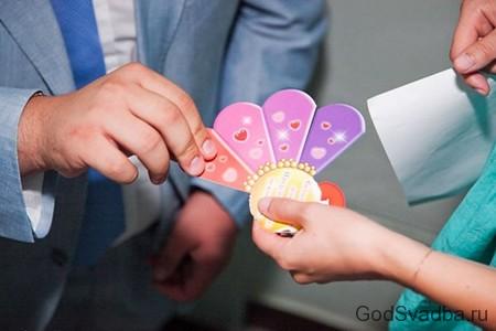 - на тарілку розкладаються часточки лимона у формі квітки, під них підкладаються записки з іменами. Потрібно, щоб наречений вибрав ту часточку, де ім’я його коханої. За кожну помилку він зобов’язаний заплатити. Він повинен відшукати ім’я коханої, і після цього конкурс завершено. Повірте: за час цього конкурсу кошик свідка може поповнитися;