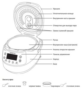 Щоб полагодити мультиварку самостійно, необхідно вивчити особливості її конструкції і механізму роботи. Зовні мультиварка має схожість з каструлею, збоку якої знаходиться міні екран і кнопка живлення. Закривається вона герметичною кришкою на защіпку. Всередині пристрою знаходиться чаша, в якій безпосередньо відбувається приготування їжі. Під чашею розташований блок живлення і управління, а також схеми.