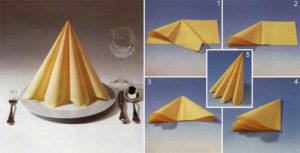 Ще один нескладний варіант — згорнути серветочку у вигляді простенької фігурки: трикутника, призми, конуса, віяла. Наприклад, для того щоб створити гарний курінь, потрібно взяти кольорову основу і слідувати цим порядком дій: