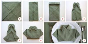 - На розстелену скатертину для кожної людини розкладається квадратом серветка одного кольору (при використанні скатертини білого кольору, вона повинна бути яскравою забарвлення; якщо ж скатертина кольорова, то основу беріть білу);