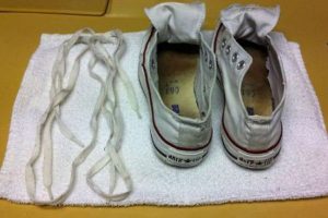 Тепер поговоримо, як правильно висушити взуття? Відмиті білі кеди від жовтих плям і бруду підвішують, спочатку стікає зайва вода, а тільки потім відбувається сушка природним шляхом.