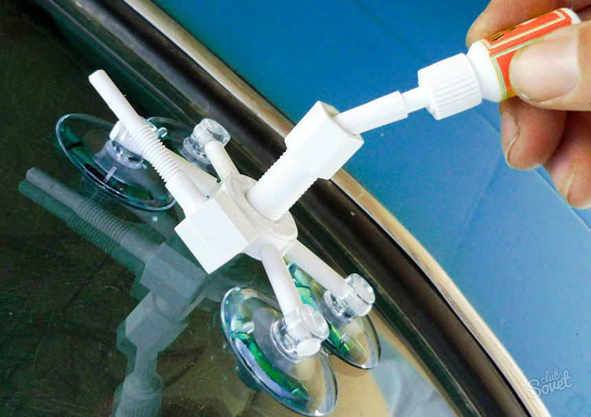 Як на лобовому склі закрити тріщину? На поверхню встановлюється інжектор. Кріпити його слід спеціальними аплікаторами. Щоб кружечки були надійно прикріплені до скла, рекомендується змазати їх вазеліном. Слідкуйте за тим, щоб інжектор перебував перпендикулярно до скла і по центру вищерблені або тріщини. Після правильно установки інжектора можна вливати фотополімерний клей.