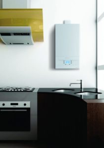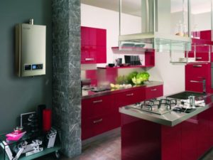 • За деякими дизайн кухонь і не скажеш, що всередині одного з шафок може ховатися газовий котел: як настінний, невеликий по габаритах, так і підлогу, відрізняється своєю громіздкістю.