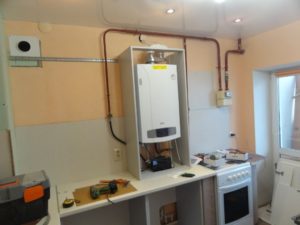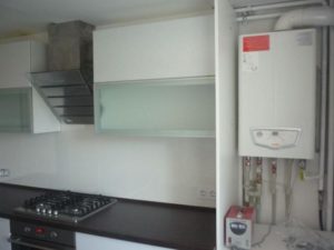 Вбудувати котел вже куплений стіна набагато складніше і не завжди можливо, тому бажано заздалегідь визначитися в необхідності його наявності. Часто просто не вистачає висоти, ширини, глибини шафи для безпечного розміщення котла в ньому. У такому випадку радять зовсім прибрати один з елементів гарнітура і поставити новий. Але робити це і необов’язково. При наявності вільного місця можна просто обшити котел зверху під дизайн кухонного гарнітура.