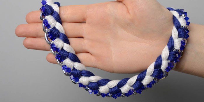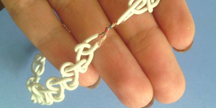 У цій техніці можна зробити чокеры не тільки з волосіні: так легко сплести намисто з старих навушників або зарядки, тільки вони повинні бути не занадто тонкими. В іншому випадку плетіння може не вийти або ж сам чокер буде занадто об’ємним – тоді прикраса тільки вкоротить шию, а не підкреслить її витонченість. Щоб урізноманітнити плетіння, рекомендується брати волосінь або проводу декількох кольорів.