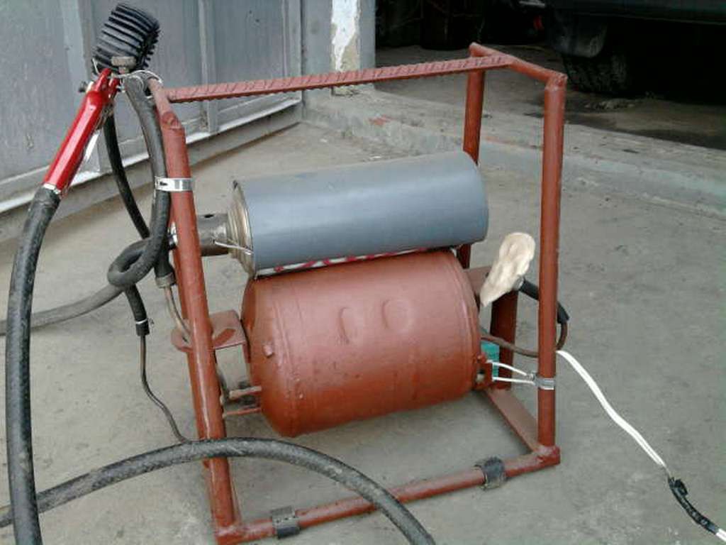 Ресивер з вогнегасника разом з мотором прикріплюємо на основу з товстої дошки. В якості засобів фіксації використовуємо гайки, шайби і шпильки. Ресивер повинен розташовуватися вертикально. Для його кріплення беремо три фанерних листа, в одному з них робимо отвір для балона. Два інших листа кріпимо до дерев’яної основи і фанерного листа, який тримає саморобний ресивер. На дно дерев’яної основи накручуємо коліщатка меблевої фурнітури для кращої маневреності механізму.