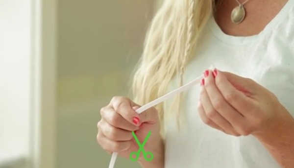 Відріж 4 шматка гумки завдовжки по 35-40 див. Встав 1 відрізок гумки в куточок простирадла та приколи його кінець у одного отвору.