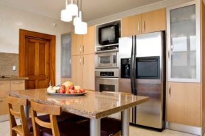 При виникненні ситуації, коли агрегат для холоду не може вписуватися в загальний дизайн кухні, на допомогу прийде спеціальне місце (шафа) куди його можна помістити, щоб він не зачіпав» погляд.