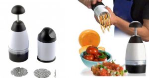 - Слайсер – чимось нагадує овощечистку, але відрізняється більшим функціоналом. Може різати продукти тонкими часточками для приготування чіпсів, або брусочками, стрічками і спіральними завитками. Перевагою виступає невеликий розмір виробу і просте обслуговування, але потрібні деякі навички для користування. Також знижений ризик порізатися або подряпатися.