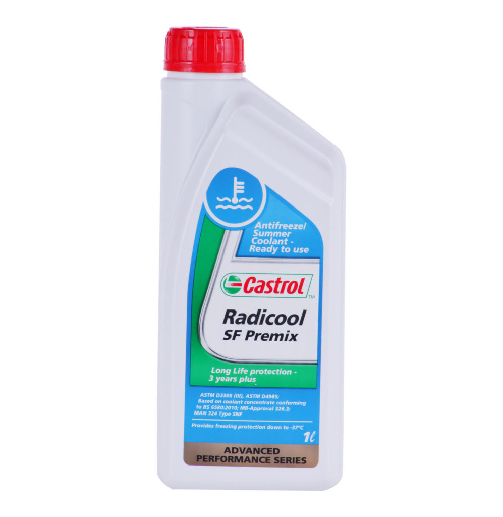 CASTROL Radicool SF premix – високоефективний концентрат універсального дії. Добре підходить для бензинових двигунів і дизелів у легковиків, вантажівок і автобусів. Термін служби складає більше трьох років. Склад розроблений таким чином, щоб забезпечити максимальний захист від корозії і запобігти відкладення кальцію на стінках системи. При цьому в ньому відсутні неорганічні інгібітори – фосфати, нітрити, силікати і т. п. Температура замерзання дорівнює -37С, а рідина закипає при 175С.