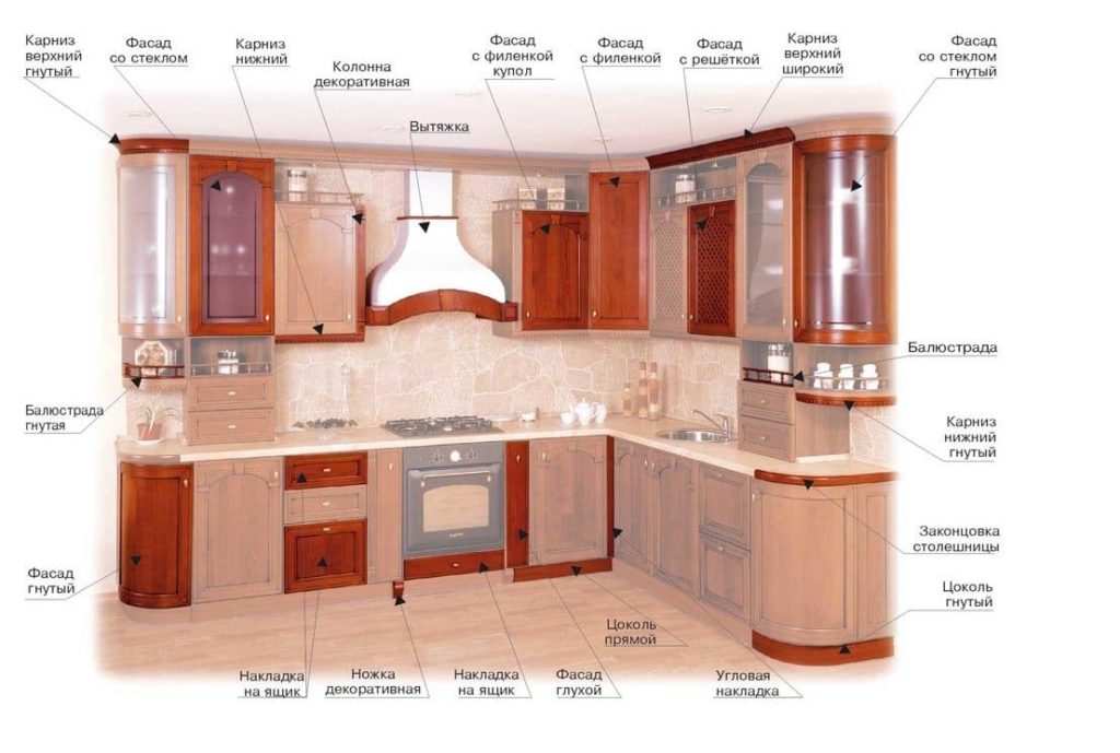 Найпростіші вимоги до наповненості кухонного гарнітура – наявність і врівноваженість елементів верхньої і нижньої ліній. Кількість підвісних шафок, матеріали, з яких вони виготовлені, залежать від навантаження, кількості одиниць зберігання, умов експлуатації. Наприклад, для вбудованої сушки для посуду потрібен шафка, корпус якого виготовлений не з простого ламінованого ДСП, як це зазвичай робиться, а з МДФ – останній вид плити не буде розшаровуватися під дією вологи. Фасад – конструктивно більш складна частина, і варіацій його виконання значно більше. Більш дешеві роблять з плити – ДСП, МДФ, шпону, а ті, які дорожчі – з меблевого щита, металу або скла. Певне значення має і зовнішній вигляд – складальні, фільончасті та гнуті фасади у виробництві обходяться дорожче, тому і вартість їх значно вище.