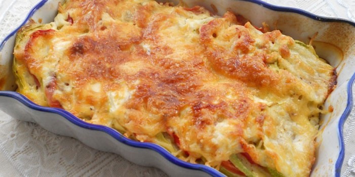 У страві, приготованому за наступним рецептом, є маленький секрет, який робить його дуже ситним, хоча і додає небагато калорій. Запечені кабачки з помідорами готуються з тоненьким прошарком відбитого філе індички. З-за останнього компонента страву вже вважається повноцінним основним, а не простий закускою. Все ж, воно легке, дієтичне і приголомшливо смачне.