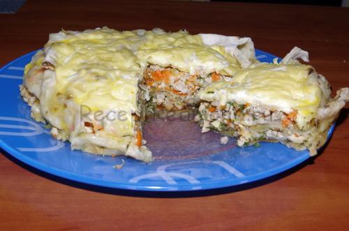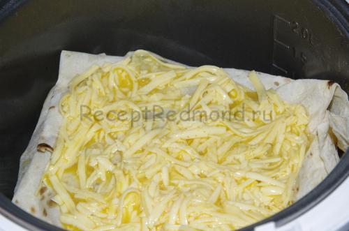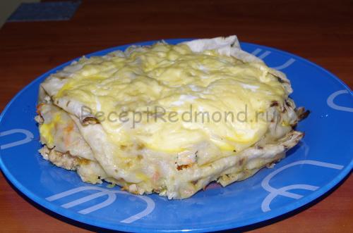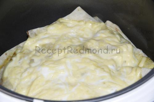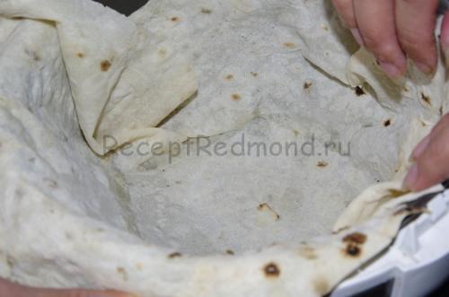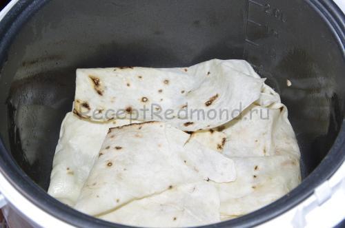 То в мультиварці Редмонд 4505 високі стінки , то листи недостатнього розміру, але в мене ні разу не вийшло лаваш викласти до самого верху, так, щоб він ще і закрив все зверху. І тоді я просто розмістила один на одному три лаваша, складених конвертом. Нижній у мене складався з сухого фаршу, а два верхніх — просочені бульйоном. У процесі готування м’ясний сік повністю проникає через всі шари лаваша і пиріг стає однорідним.
