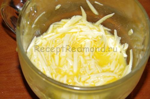 Змішайте яйце і натертий на крупній тертці сир. Для тих, хто не боїться калорійних страв можна розподілити зверху ще й шматочки вершкового масла.