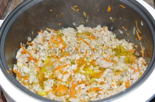 Першим ділом смажиться фарш. На однойменному режимі протягом 15 хвилин все тушкується разом з дрібно нарізаною цибулею і морквою в рослинному маслі. Сіль і перець кладуть за смаком. А за кілька хвилин до готовності додайте у фарш пів-склянки бульйону.
