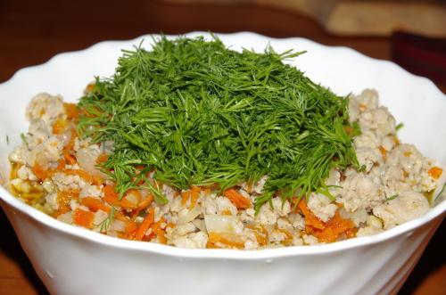 Викладіть готовий фарш в тарілку і додати туди дрібно нарізаний кріп. Слід почекати, поки все не охолоне, так як є ризик прорвати лаваш гарячою сумішшю.
