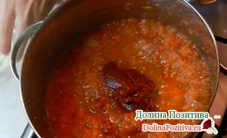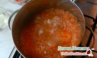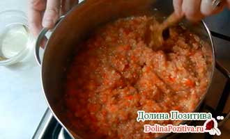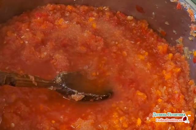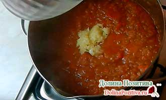 Потім додаємо томатну пасту, спеції, гострий перчик (перекручений) і масло. Кип’ятимо хвилин 10.