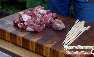М’якоть баранини розрізаємо на шматки розміром з дитячий кулак. Нанизуємо на шпажки.