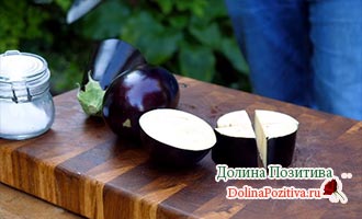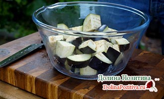 На великі шматки рубаємо баклажани. Засипаємо їх сіллю, перемішуємо і залишаємо на 20 хвилин, щоб пішла гіркота.
