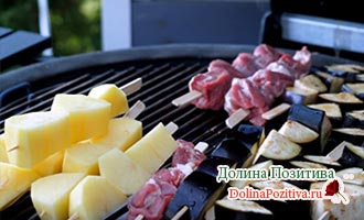Через 20 хвилин синенькі промиваємо водою. Цибуля, картопля, томати розрізаємо на шматки, по черзі нанизуємо овочі на шпажки.