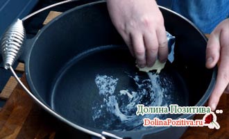 Інгредієнти готові. Змащуємо вершковим маслом дно казана. А якщо ви готуєте в горщиках, то дно керамічного горщика. Масло можна замінити курдючним салом.