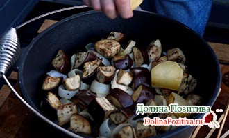 Викладаємо шарами: м’якоть баранини, кільця цибулі, баклажани, картопля, помідори, болгарський перець, 4 шматочки вершкового масла.