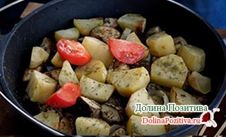 Шар синеньких не солимо. А інші шари підсолюємо, перчимо, посипаємо хмелі-сунелі. Якщо готуєте вдома, горщики закрийте фольгою. Томіть страву 1,5-2 години в духовці.