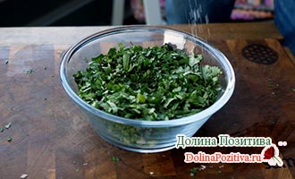 5 зубчиків часнику, зелена цибуля, базилік, чилі і кінзу подрібнюємо ножем. До зелені додаємо солі і свіжомеленого перцю.