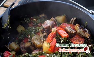 Суміш зелені додаємо в казан за 15 хвилин до готовності страви.